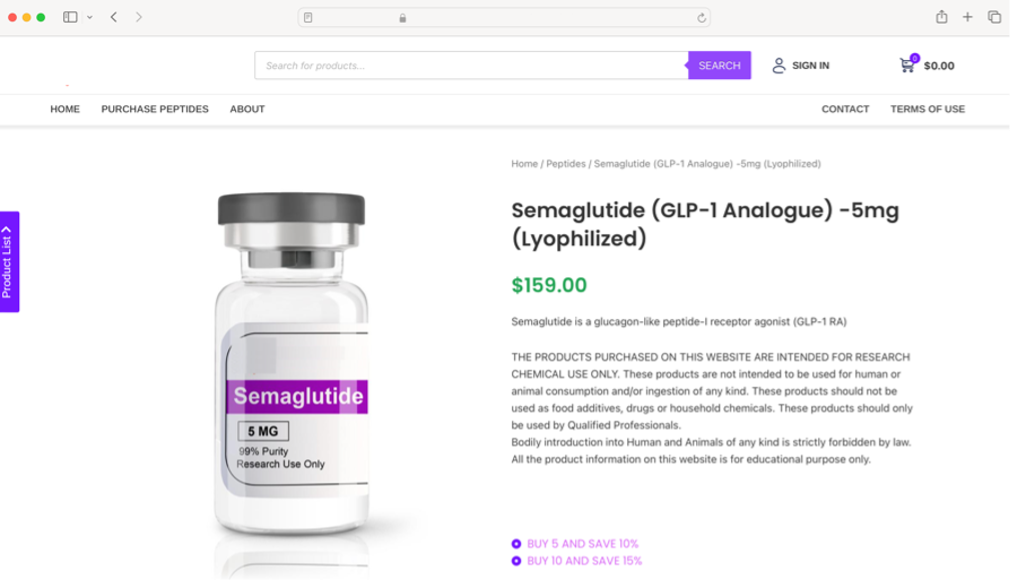 Historically, high-risk peptide merchants offered products that primarily appealed to the bodybuilding community; however, these merchants are now actively promoting GLP-1 agonists, a class of prescription-only drugs that includes semaglutide (the active ingredient in Ozempic™, Wegovy™, and Rybelsus™) and tirzepatide (the active ingredient Mounjaro™ and Zepbound™). See the example below.