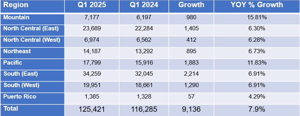 Lowa (+6.6%) led in percentage growth and had the largest volume growth (+52). - Northeast Region