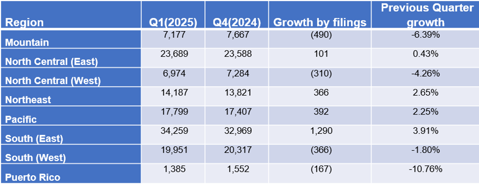 When looking at all regions of the country in the first quarter of 2025 vs. the first quarter of 2024, the Mountain region of the country experienced the largest percentage growth in bankruptcy filings. This region is composed of Arizona, Colorado, Idaho, Montana, New Mexico, Utah, and Wyoming, has shown a 15.81% increase in filings from Q1 2024. Montana and New Mexico led the region in the filings.